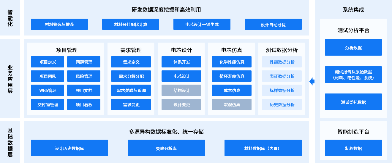 电池研发BDA为电芯研发工程师提供电芯快速设计工具、管理系统和材料数据库,实现电芯研发从基于经验的设计到基于材料数据库和人工智能的智能辅助设计,打通产品需求信息、设计信息、试制信息及测试信息的数据壁垒,在一个平台上实现从原材料到产品数据的全生命周期管理。